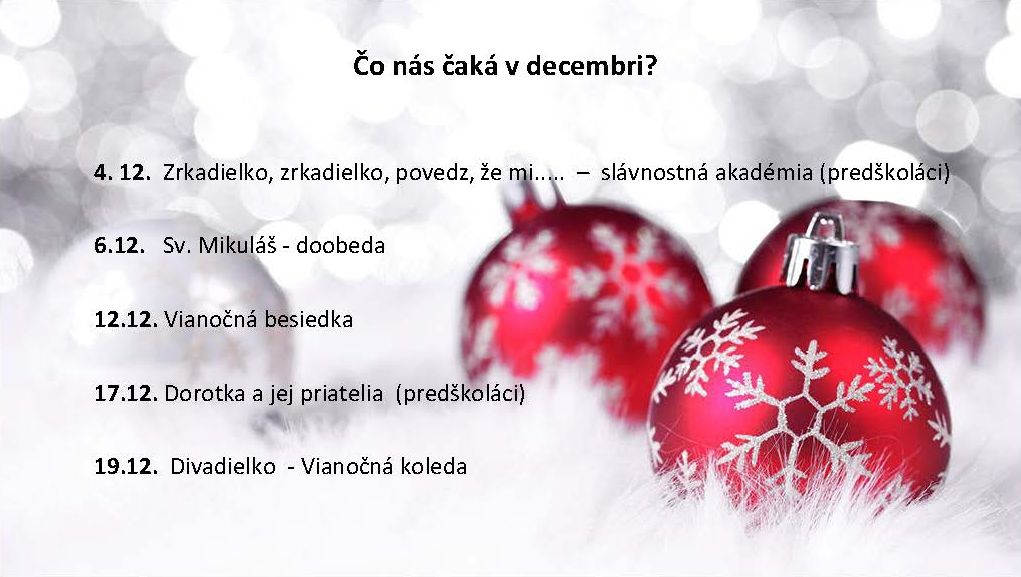 Čo nás čaká v decembri? Vytlačiť E-mail 04. 12. - Zrkadielko, zrkadielko, povedz, že mi..... - slávnostná akadémia (predškoláci) 06. 12. - Sv. Mikuláš - doobeda 12. 12. - Vianočná besiedka 17. 12. - Dorotka a jej priatelia (predškoláci) 19. 12. - Divadielko - Vianočná koleda