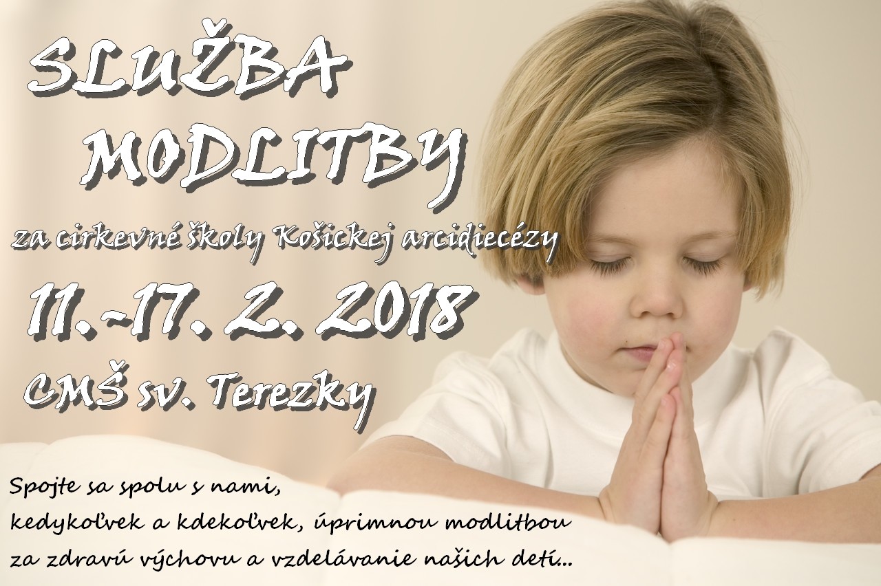 Služba modlitby Vytlačiť E-mail Služba modlitby za cirkevné školy Košickej arcidiecézy 11. - 17. 02. 2019CMŠ sv. Terezky Spojte sa spolu s nami, kedykoľvek a kdekoľvek, úprimnou modlitbou za zdravú výchovu a vzdelávanie našich detí...