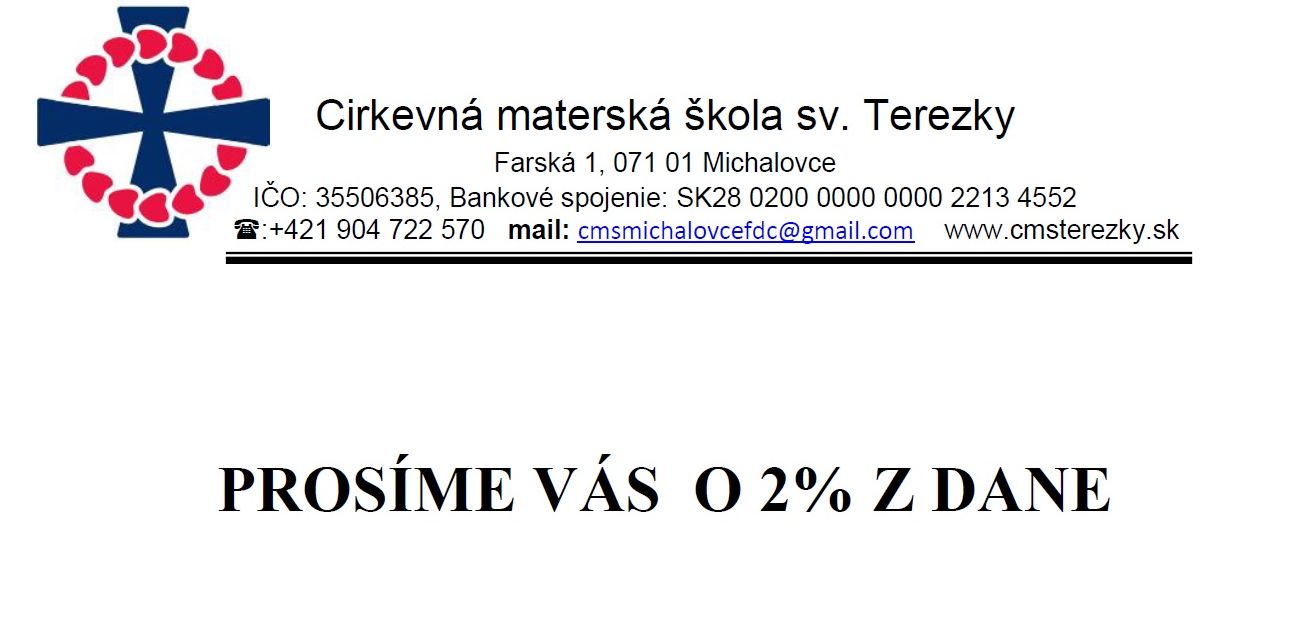 Materská škola sv. Terezky sa aj tento rok uchádza o získanie 2% z dane, ktoré môžete darovať. Suma, ktorá sa vyzbiera poslúži na čiastočné pokrytie nákladov spojených s plánovanými akciami na zveľadenie a úpravu priestorov, v ktorých trávia Vaše deti väčšinu času. Vopred ďakujeme za Vaše dary a vyprosujeme Vám veľa Božích milostí.